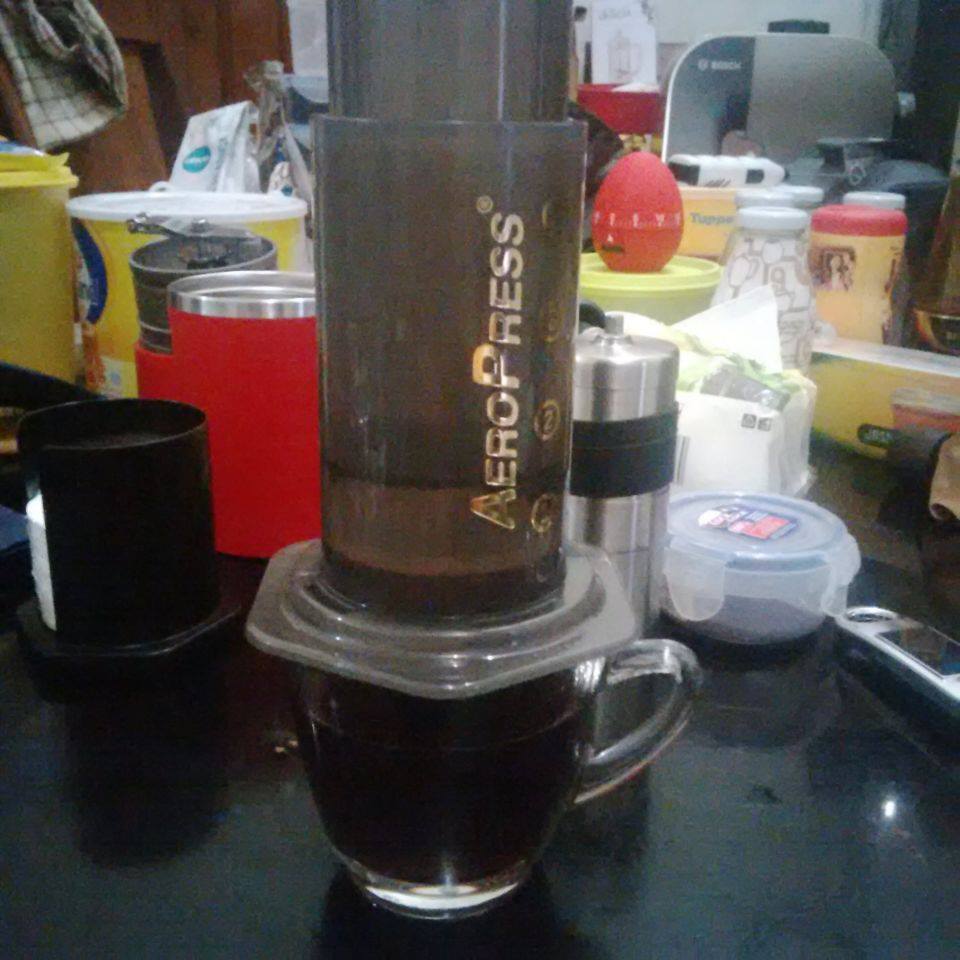First time using my AeroPress. Pake rasio 1:10, 20 gram kopi 200 gram air suhu 80 dercel. Kebayang kan gimana repotnya pake AeroPress. Harus keluarin timbangan yang biasa kupake buat nimbang bahan kue, buat nimbang air. Maklum belum punya timbangan digital. Aneh kan, biasanya ukuran cairan kan cc ato ml gitu, ini mintanya dalam gram.… Continue reading First Time Using AeroPress